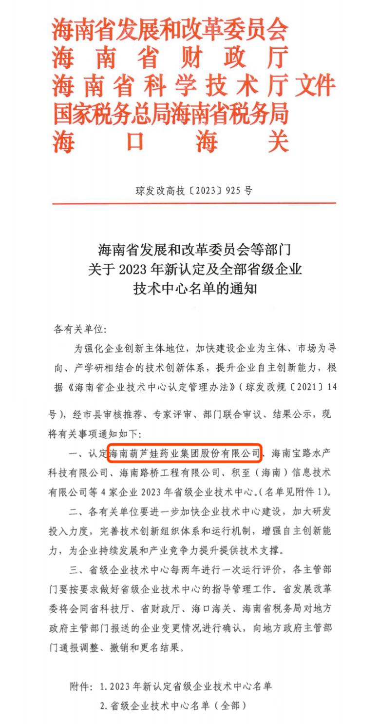 近日,海南省发改委等多部门联合公布了《关于2023年新认定及全部省级企业技术中心名单的通知》,其中,海南百亿药业集团股份有限公司成功通过评审,被认定为省级企业技术中心,是本次获批的4家企业之一。